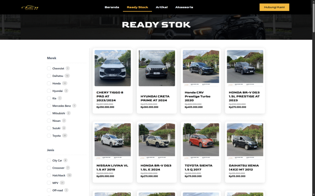 Dari sini, kami membantu Auto 77 membangun website profesional untuk meningkatkan brand awareness dan memberikan kemudahan bagi calon pembeli dalam mencari mobil impian mereka.